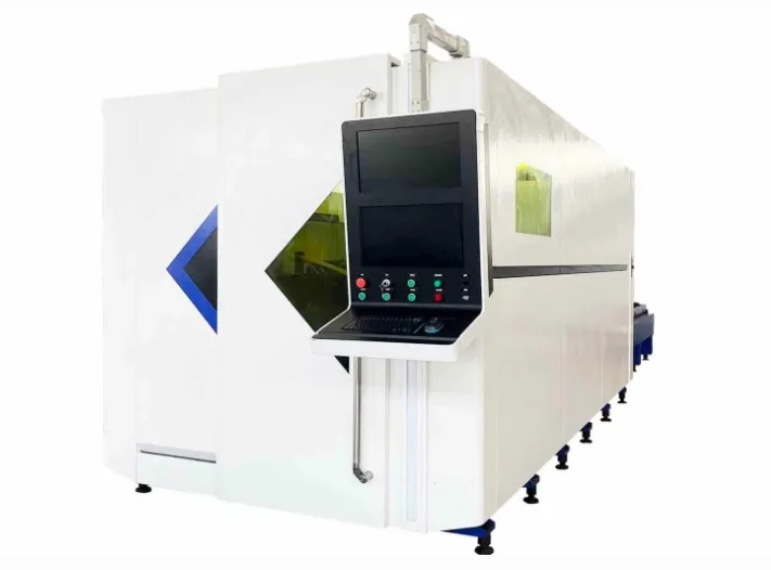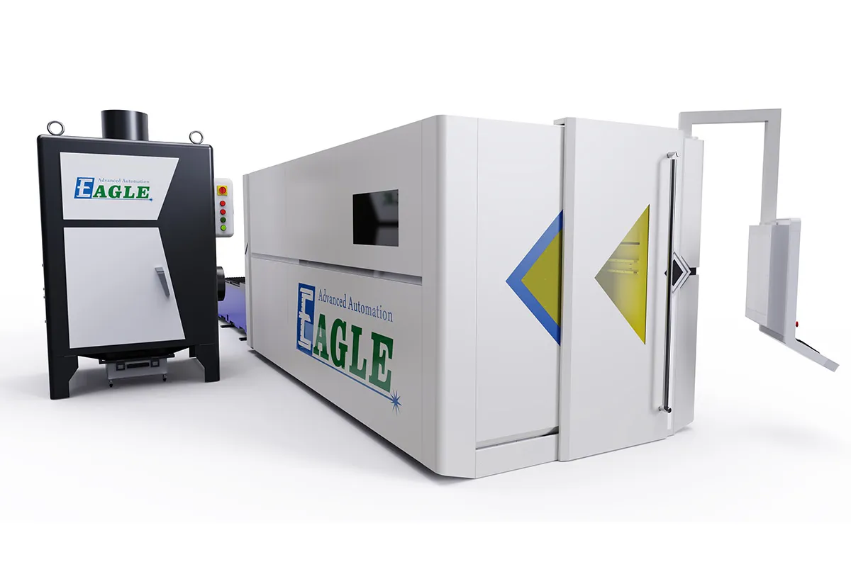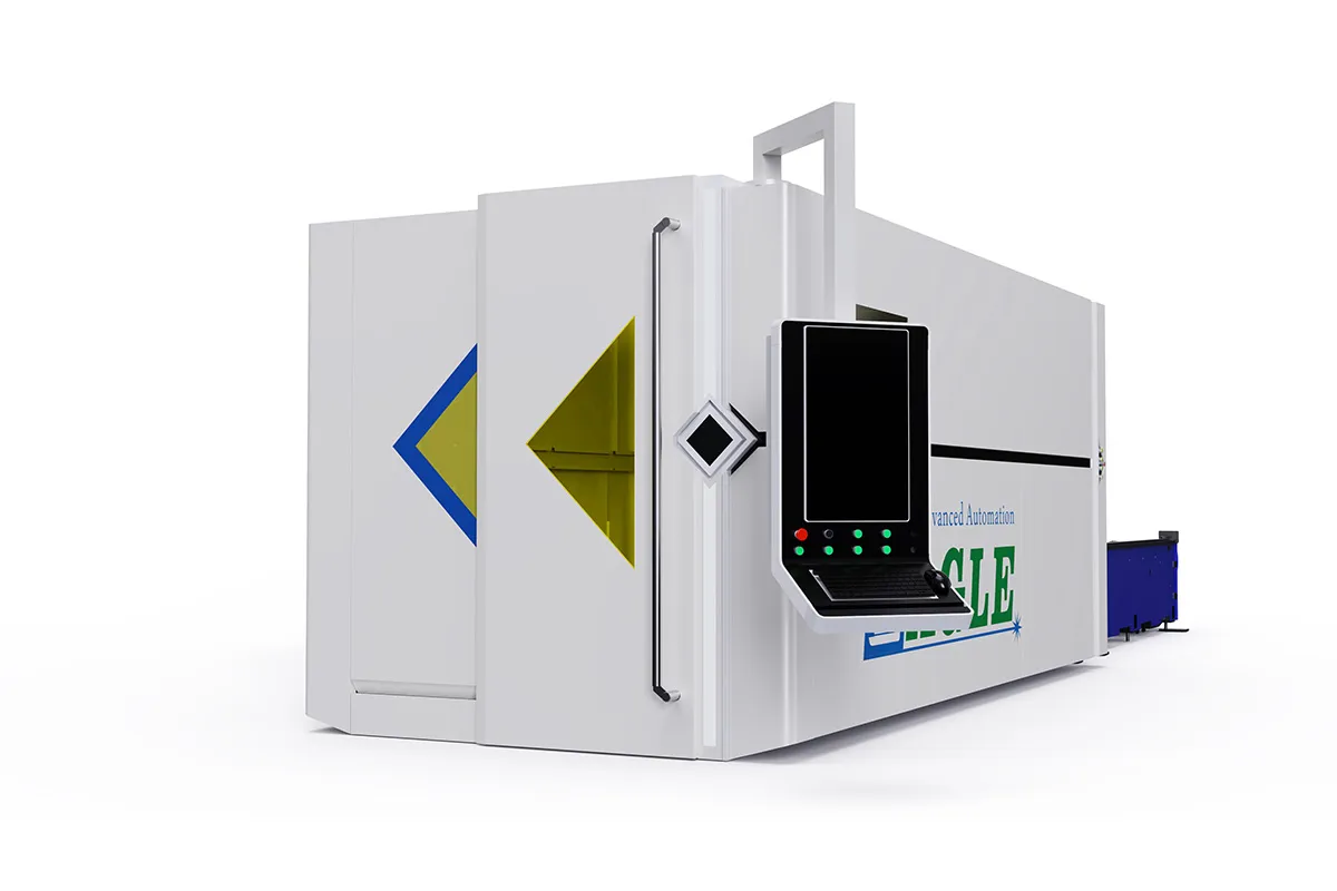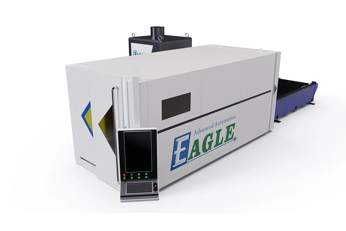 The enclosed flatbed fiber laser cutting machine is designed for high-speed cutting of various metal sheets. It provides a reliable solution for ultra-fast production, meeting the demands of large-format, high-volume, and high-efficiency sheet metal processing. The laser cutting machine is widely used for high-precision cutting of materials such as carbon steel, stainless steel, tinplate, galvanized sheet, aluminum, and copper. With a laser head acceleration of over 1.0G and a working area of 5′×10′, the laser machine comes equipped with nesting software to optimize material usage and minimizes waste, ensuring that production is both efficient and cost-effective. It is available in 6kW, 12kW, or 20kW models, capable of cutting stainless steel thicker than 2 inches.