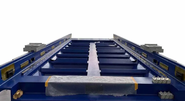 The laser machine is designed with interchangeable working beds for efficient loading and unloading during the cutting process.